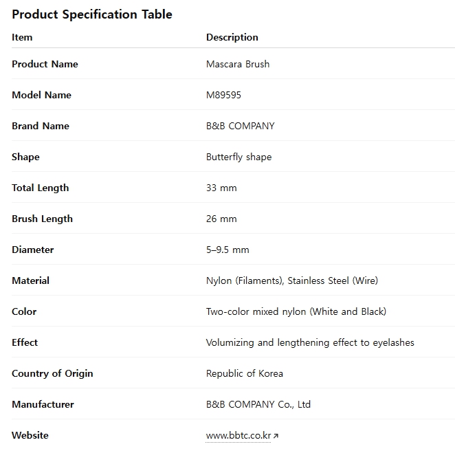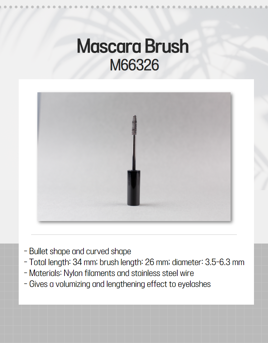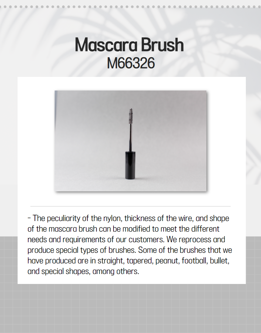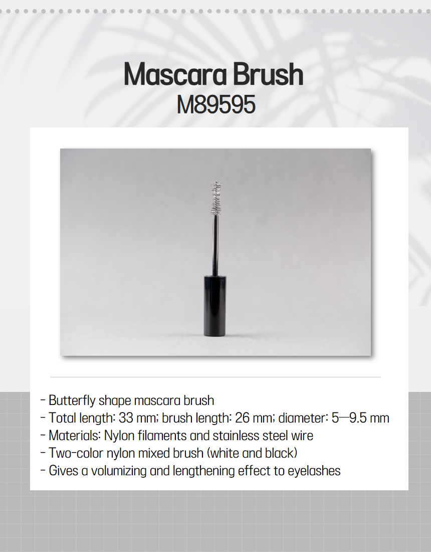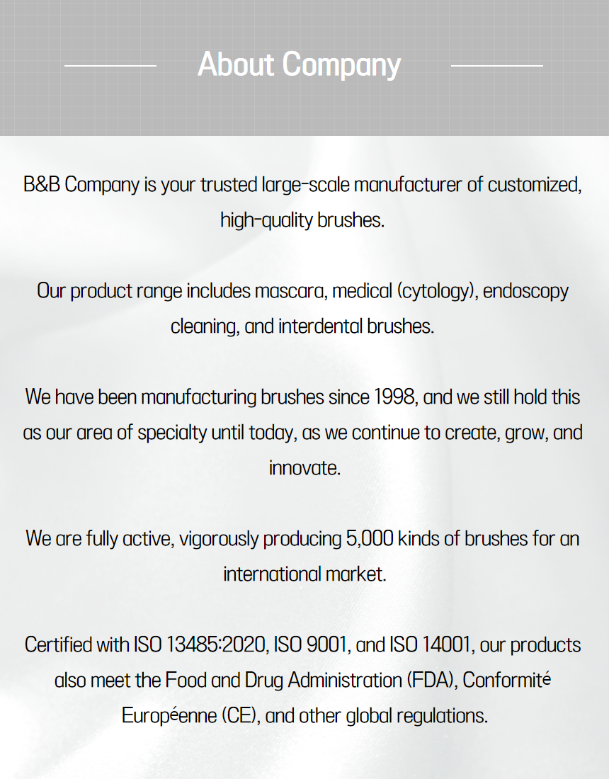 B&B Company is your trusted large-scale manufacturer of customized, high-quality brushes. Our product range includes mascara, medical (cytology), endoscopy cleaning, and interdental brushes. We have been manufacturing brushes since 1998, and we still hold this as our area of specialty until today, as we continue to create, grow, and innovate.We are fully active, vigorously producing 5,000 kinds of brushes for an international market.Certified with ISO 13485:2020, ISO 9001, and ISO 14001, our products also meet the Food and Drug Administration (FDA), Conformité Européenne (CE), and other global regulations.M66326- Bullet-type and curved shape- Total length: 34 mm; brush length: 26 mm; diameter: 3.5-9-6.3 mm- Materials: Nylon filaments and stainless steel wire- Gives a volumizing and lengthening effect to eyelashes- The peculiarity of the nylon, thickness of the wire, and shape of the mascara brush can be modified to meet the different needs and requirements of our customers. We reprocess and produce special types of brushes. Some of the brushes that we have produced are in straight, tapered, peanut, football, bullet, and special shapes, among others.- Butterfly-shaped mascara brush - Total length: 33 mm; brush length: 26 mm; diameter: 5—9.5 mm- Materials: Nylon filaments and stainless steel wire- Two-color nylon mixed brush (white and black) - Gives a volumizing and lengthening effect to eyelashes- The peculiarity of the nylon, thickness of the wire, and shape of the mascara brush can be modified to meet the different needs and requirements of our customers. We reprocess and produce special types of brushes. Some of the brushes that we have produced are in straight, tapered, peanut, football, bullet, and special shapes, among others.