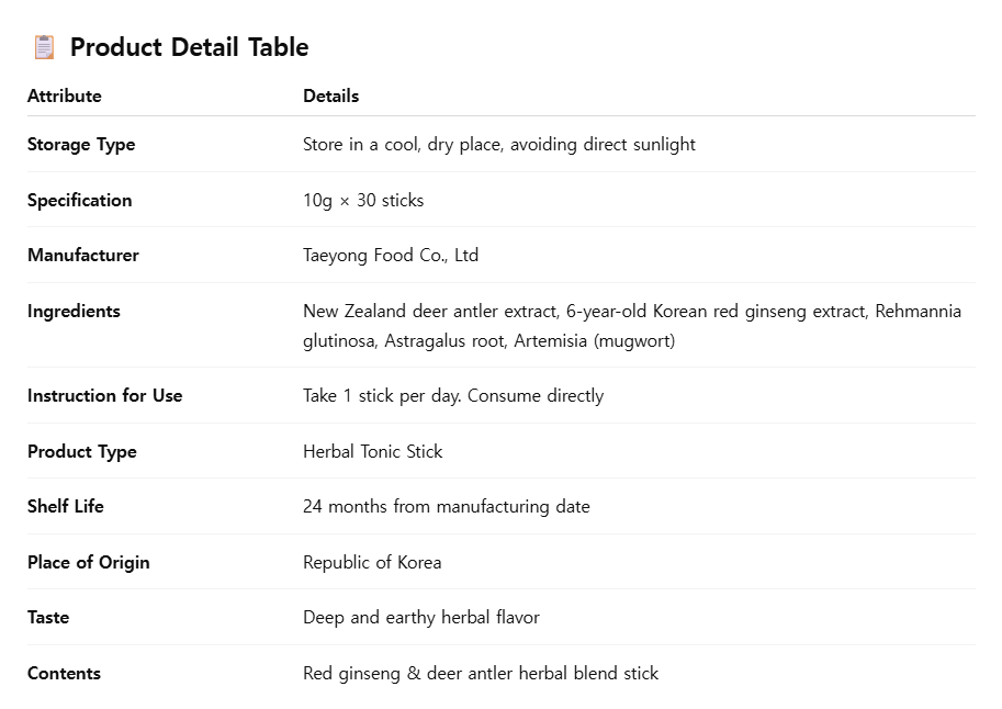 English: Item Code: A23000994 Specification: 10 g * 30 packs Storage method: Store in a cool place, avoiding direct sunlight. How to take: Take 1 pack once a day. Certification: HACCP, ISO22000 “A rich harmony of 6-year-old red ginseng and pomegranate, one pack for a refreshing daily health” This is a premium health stick made by combining Spanish pomegranate concentrate (100%) and 6-year-old red ginseng concentrate. The rich sourness of pomegranate is combined with the deep flavor of luxurious red ginseng, so anyone, regardless of age or gender, can enjoy it without burden. “Refreshing and immunity at the same time! Start a healthy routine of one pack a day in your busy daily life.” It is made in a 10g stick-type pouch, so it is easy to carry and hygienic to take, making it perfect before work or when going out.