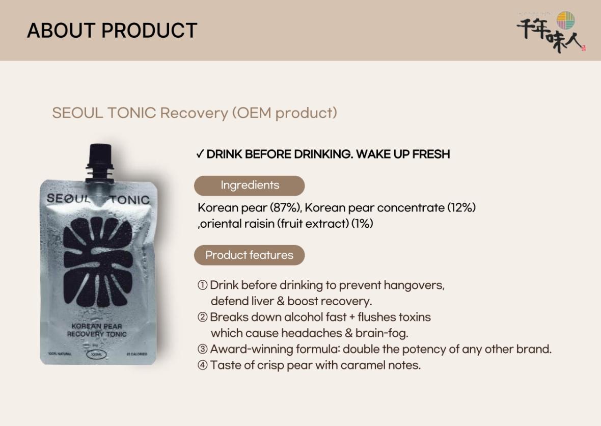Seoul Tonic Season 1 is a 100% organic, non-alcoholic, additive-free tonic made with rich Korean pear juice, pear extract, and Korean red ginseng for a naturally sweet and easy-to-drink flavor. Crafted through low-temperature juicing and a HACCP-certified process, it offers a safe, nutritious beverage ideal for both children and adults.