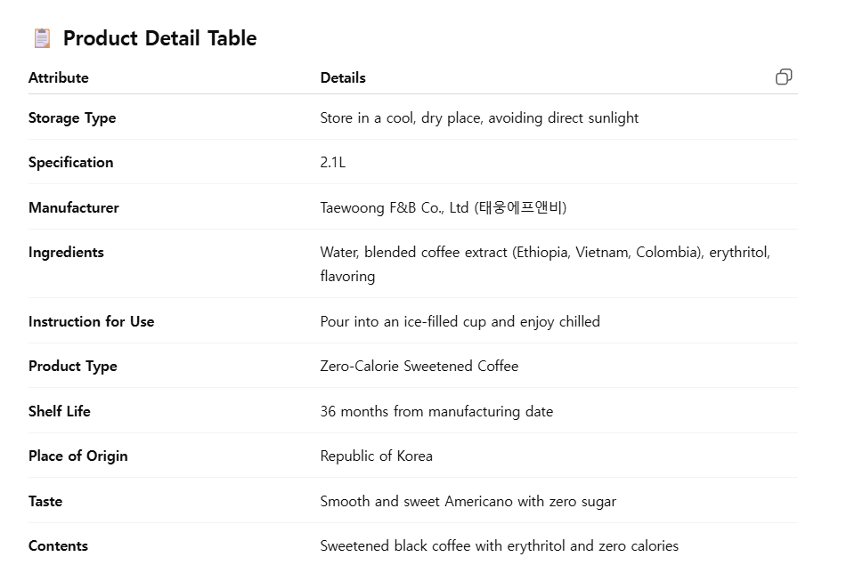 Item Code: A23001250 Specification: 2.1L Storage: Store in a cool place, avoiding direct sunlight. How to consume: Pour into an ice cup and drink cool Certification: HACCP, ISO22000 “Americano with a richer and more intense sweetness, upgraded coffee experience” We have preserved a deeper coffee bean flavor than existing products, and kept the sweetness light with erythritol. This is a high-quality blended coffee with a large capacity 2100ml pouch that can be used in cafes and stores. When you want to leave a lingering impression with a cup of coffee, experience the rich and sweet balance. When you drink it cold, the body and sweetness come alive more clearly.