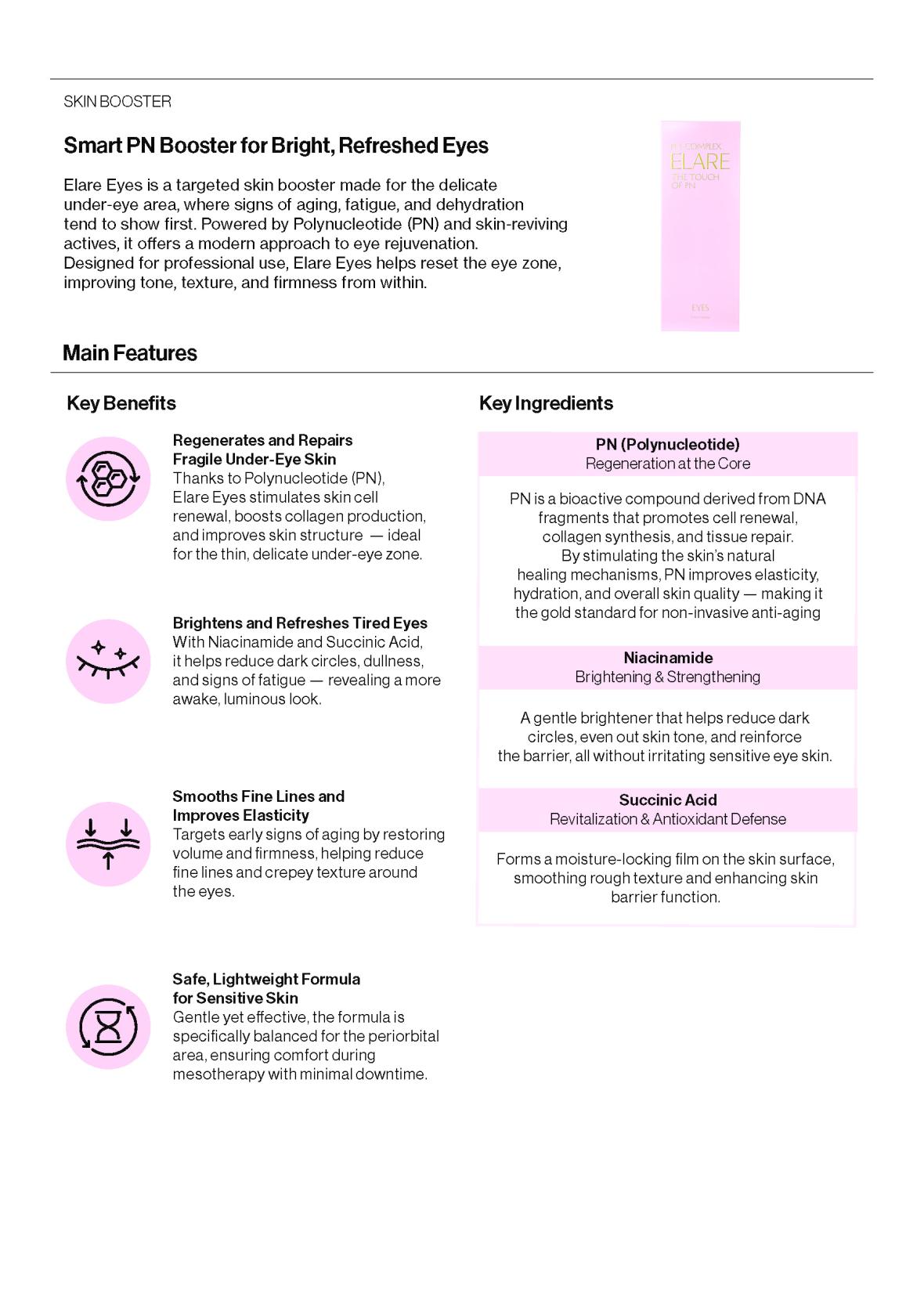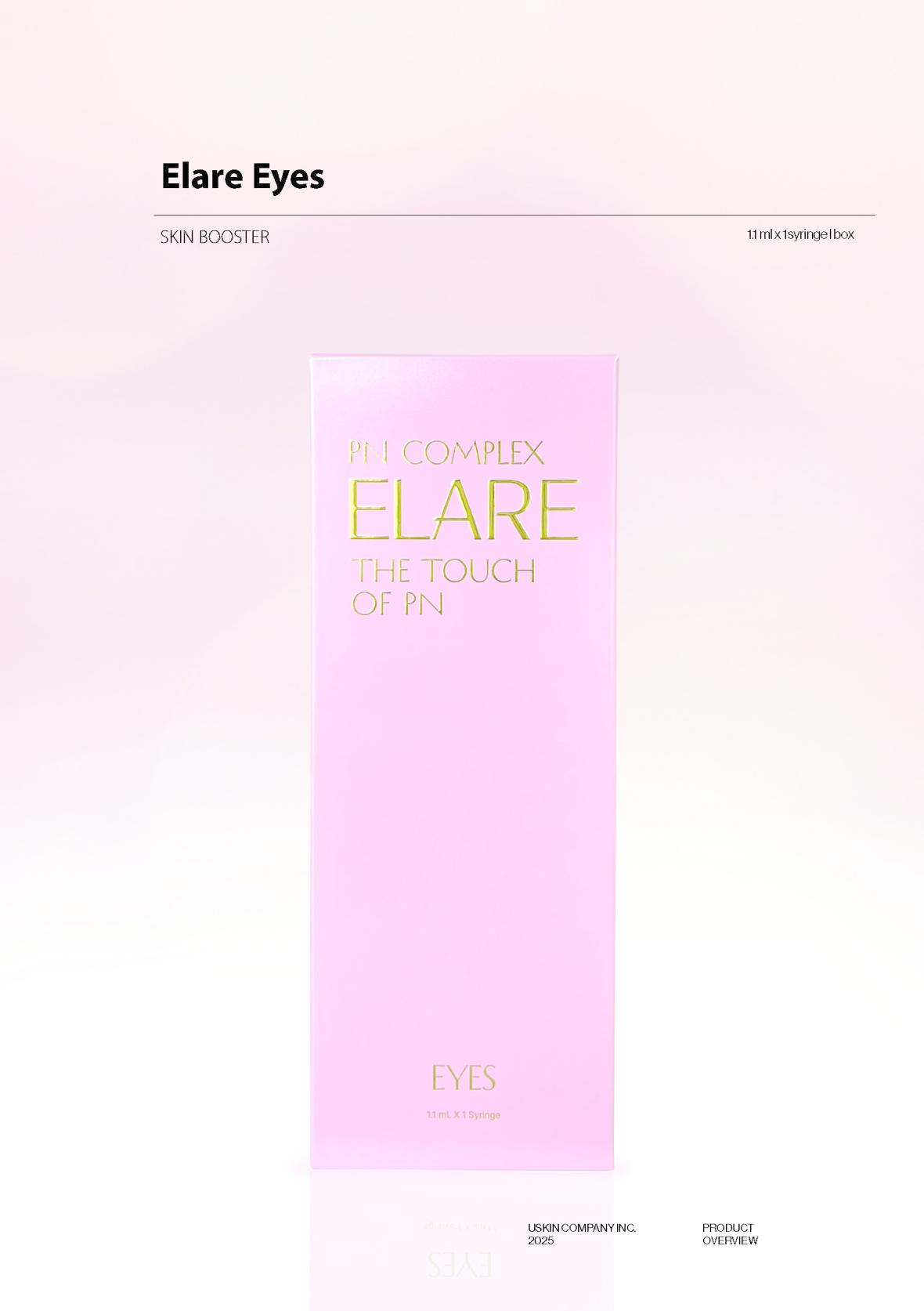 Elare Eyes delivers 0.5% Polynucleotide (PN) to the delicate under-eye skin, promoting cell renewal and collagen synthesis. This helps smooth fine lines and strengthens the skin structure around the eyes.
