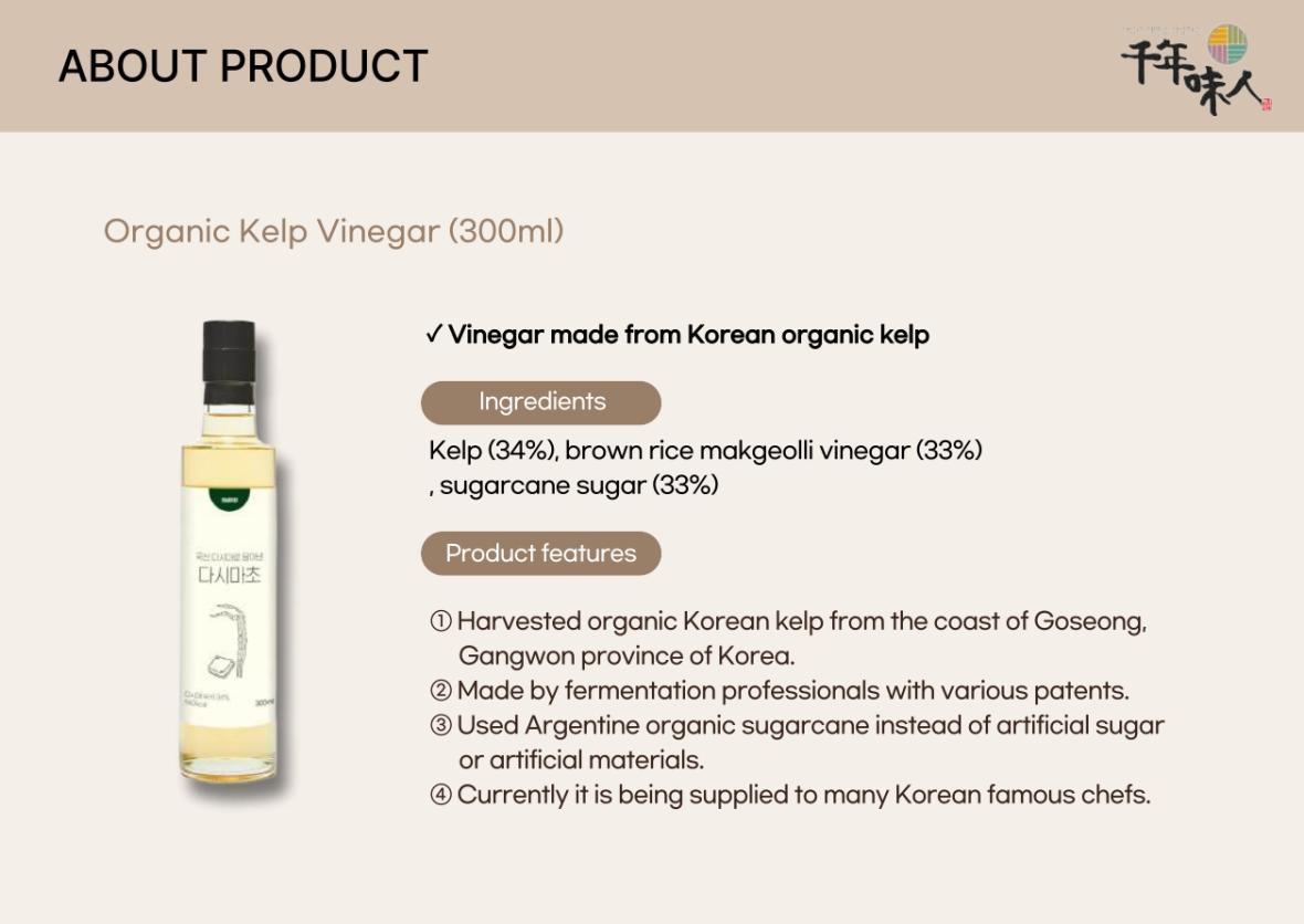 Kelp vinegar is effective for dieting, facilitates waste discharge, and is good for preventing aging. In addition, it helps control the blood sugar level, smooth intestinal exercise, suppress cancer cell proliferation, and prevent high blood pressure. In Korea, many women use it for dieting and skin care purposes. The way to drink is to drink strawberry vinegar if you drink water in a 9 to 1 ratio and carbonated water in a ratio of 8 to 2. There is no preservative in it, so you must keep it in the refrigerator after opening it.
