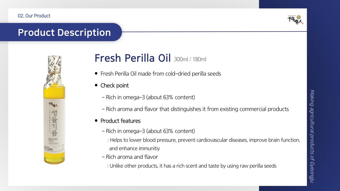 Perilla Oil is a 100% organic, cold-pressed, additive-free Korean oil made through a HACCP-certified process to preserve its pure aroma and flavor. Carefully roasted at 160°C and filtered for exceptional clarity, it offers a safe, premium-quality ingredient ideal for enhancing dishes like bibimbap, noodles, and other Korean cuisine.