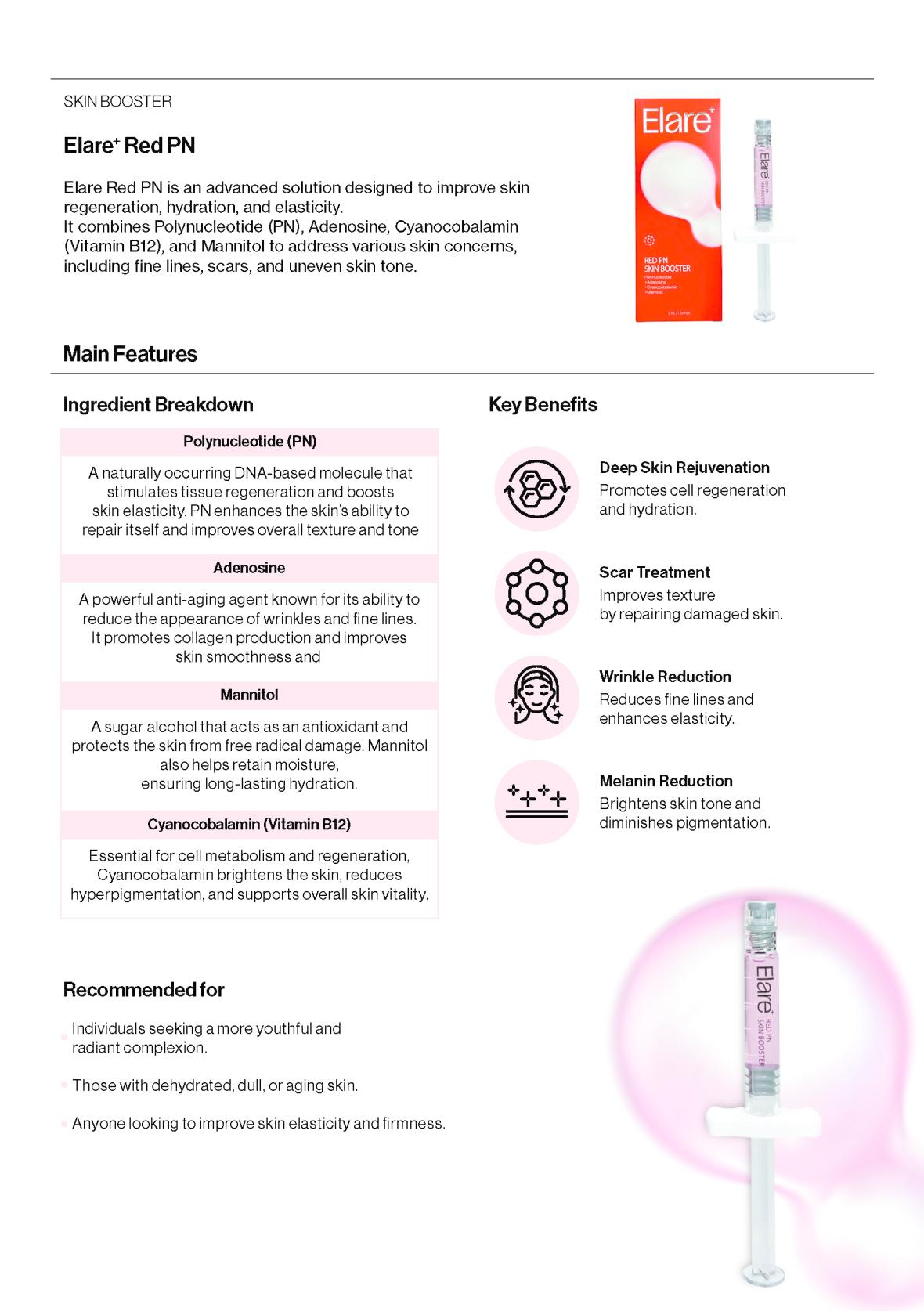 Designed for dullness, dehydration, scars, wrinkles, and pigmentation, Elare+ Red PN provides comprehensive improvement in texture, tone, and radiance. It revitalizes the skin from within and supports long-term structural enhancement.